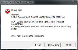 HEAP CORRUPTION DETECTED 발생 void CIni::SaveString(const TCHAR *KeyName, TCHAR *value) { int strLen = _tcslen(value); TCHAR *strQuot = new TCHAR[strLen + 1]; strQuot[0] = _T('\"'); _tcsncpy(strQuot + 1, value, strLen); strQuot[strLen + 1] = _T('\"'); strQuot[strLen + 2] = _T('\0'); WritePrivateProfileString(_appName, KeyName, strQuot, _fileName); delete[] strQuot; } 위와 코드 delete[] 부분에서 아래와 같은 에러가..