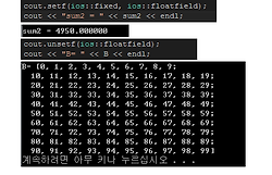 cout 에서 소수점 고정 하기 위해 필요한 함수 들이다. cout.precision(5)cout.setf(ios::fixed, ios::floatfield); 이렇게 적으면 cout 을 쓰면 계속 유지가 된다. 해제는 다음과 같이 하자 cout.unsetf(ios::floatfiled); cout 관련된 홈페이지 : http://www.cplusplus.com/reference/ios/ios_base/